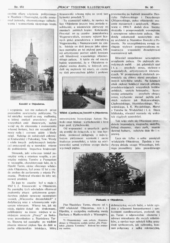 Przeglądając arkusze drukującego się w „Pracy” dzieła spotkałem się tam z lakoniczną wzmianką o pobycie Józefa Ignacego Kraszewskiego w Objezierzu i o lipie Kraszewskiego rosnącej w tamecznym parku. Ponieważ nie może być nam obojętną miejscowość, która gościła najznakomitszego swego czasu pisarza polskiego, postanowiłem zebrać na miejscu garść danych odnoszących się tak do miejsca samego jak do jego mieszkańców. Jakoż rychło znalazła się sposobność do wycieczki do Objezierza, a uprzejmość dziedzica umożliwiła zaczerpnięcie pożądanych informacyj.