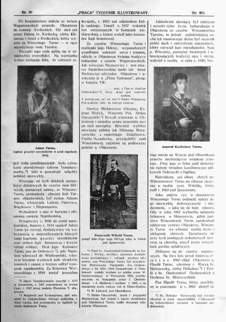 Po bezpotomnem zejściu ze świata Węgorzewskich przeszło Objezierze do rodziny Kwileckich. Od nich zaś przez Helenę hr. Kwilecką, córkę Klemensa i Anieli z Kwileckich, która wyszła za Wincentego Turno – w ręce starożytnego rodu Turnów. Początki tego rodu gubią się w zamierzchłej przeszłości. N a wzmiankę jednak zasługuje fakt, że czterech te Po bezpotomnem zejściu ze świata Węgorzewskich przeszło Objezierze do rodziny Kwileckich. Od nich zaś przez Helenę hr. Kwilecką, córkę Klemensa i Anieli z Kwileckich, która wyszła za Wincentego Turno – w ręce starożytnego rodu Turnów. Początki tego rodu gubią się w zamierzchłej przeszłości. Na wzmiankę jednak zasługuje fakt, że czterech te goż rodu przedstawicieli było członkami starożytnego zakonu Templaryuszów, fakt w genealogii szlachty polskiej nie zwykły. Wracając od tych dalekich perspektyw dziejowych do czasów nam bliższych, zaznaczyć należy, że Wincenty Turno, protoplasta obecnej linii Turnów objezierskich, był synem Adama Turno właściciela Luboni, Oporowa, Więckowic i Niepruszewa. Wchodzimy z nim w barwną i płomienną epopeję Napoleońską. Wstąpiwszy r. 1806 do armii napoleońskiej, dopiero r. 1814 opuścił Adam Turno jej szeregi, dosłużywszy się wa-lecznością w nieprzeliczonych bitwach rangi kapitana gwardyi szwoleżerów oraz orderu legii honorowej i krzyża virtuti militari. Brat jego Kaźmierz Turno, pan na Dobrzycy, gdy Napoleon wkroczył do Wielkopolski, własnym kosztem wystawił pułk strzelców konnych i razem z bratem odbył kampanie napoleońskie. Za Księstwa Warszawskiego r. 1810 został jenerałem brygady, r. 1813 zaś adiutantem króla saskiego. Umarł r. 1817 wskutek ran otrzymanych w kampanii moskiewskiej, z której wrócił jako komandor legii honorowej. Za czasów Wincentego Turno i małżonki jego Heleny, wyposażonych wszelkie mi zaletami serca i rozumu, odżyły w Objezierzu świetne tradycye kulturalne z czasów Węgorzewskich. Jak wówczas Niemcewicz i inni pisarze Stanisławowskiej epoki tak teraz Mickiewicz odwiedza Objezierze i uwiecznia je w „Panu Tadeuszu”, pisząc w księdze VII:
