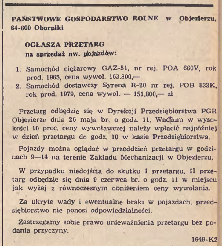 Przetarg odbędzie się w Dyrekcji Przedsiębiorstwa PGR Objezierze dnia 26 maja br.. o godz. 11. Wadium w wysokości 10 proc. ceny wywoławczej należy wpłacić najpóźniej w dzień przetargu do godz. 10 w kasie Przedsiębiorstwa. Pojazdy można oglądać w przeddzień przetargu w godzinach 9-14 na terenie Zakładu Mechanizacji w Objezierzu. W przypadku niedojścia do skutku I przetargu, II przetarg odbędzie się dnia 9 czerwca br. o godz. 11 w miejscu jak wyżej z równoczesnym obniżeniem ceny wywołania.