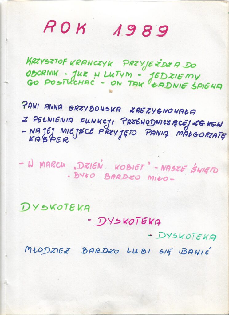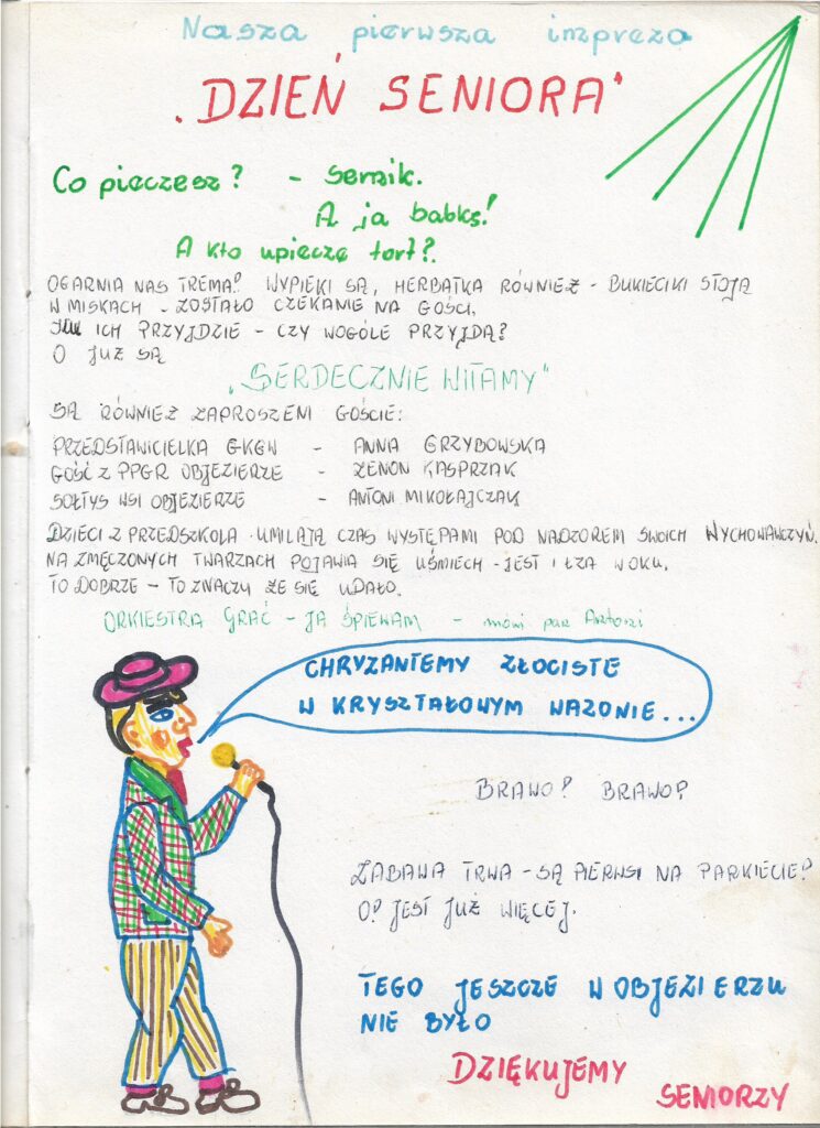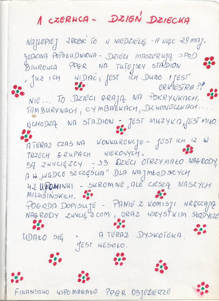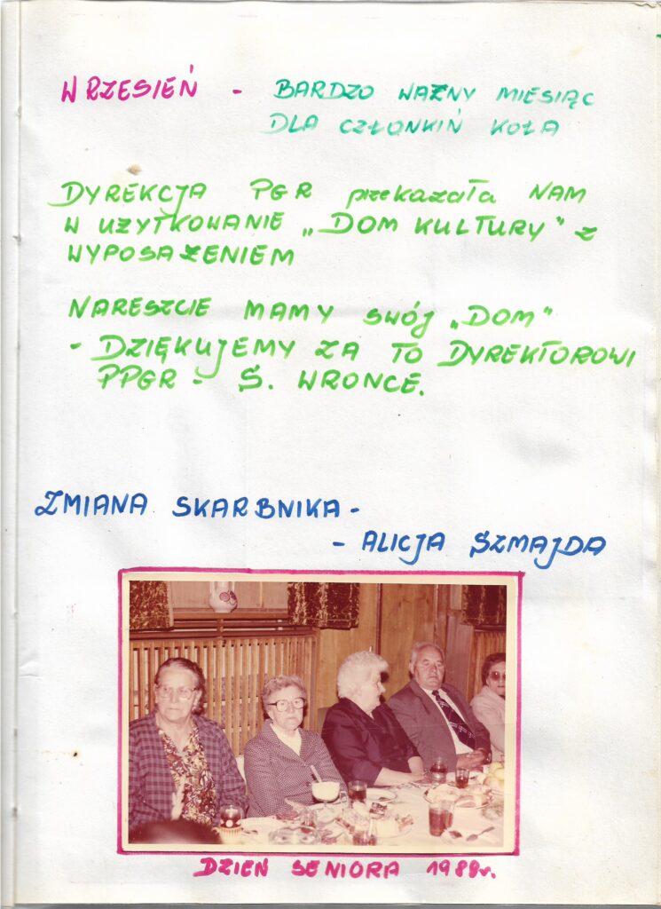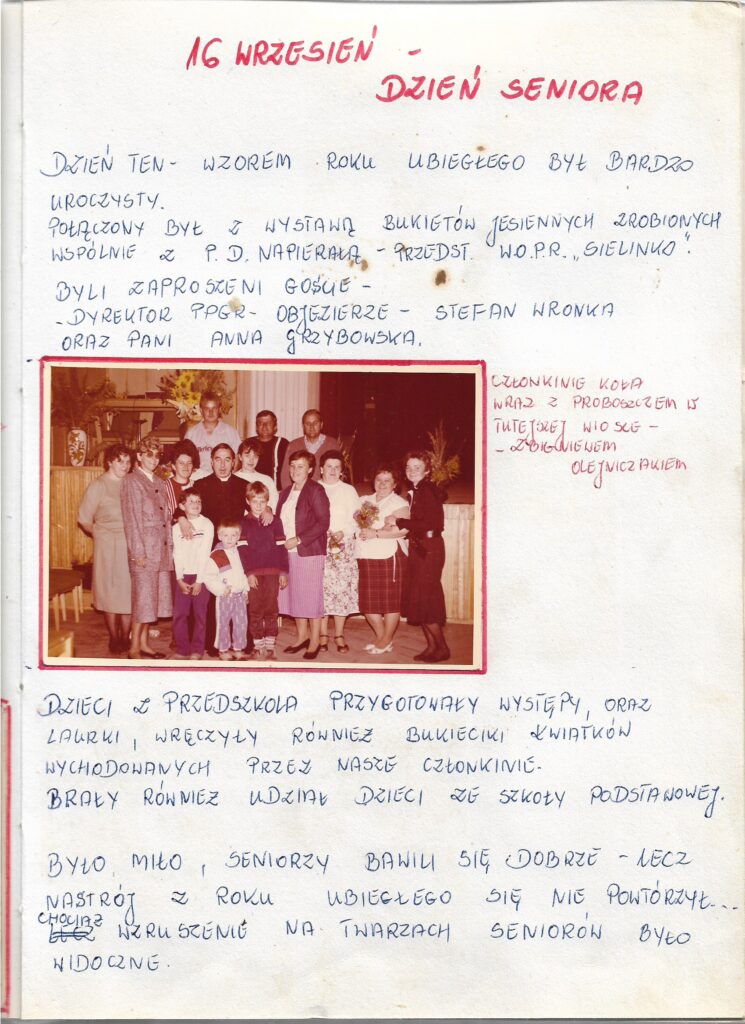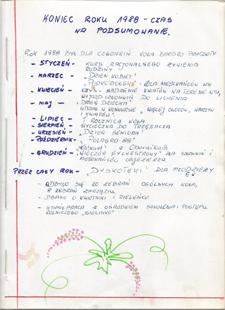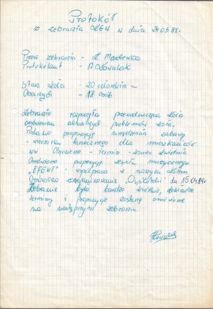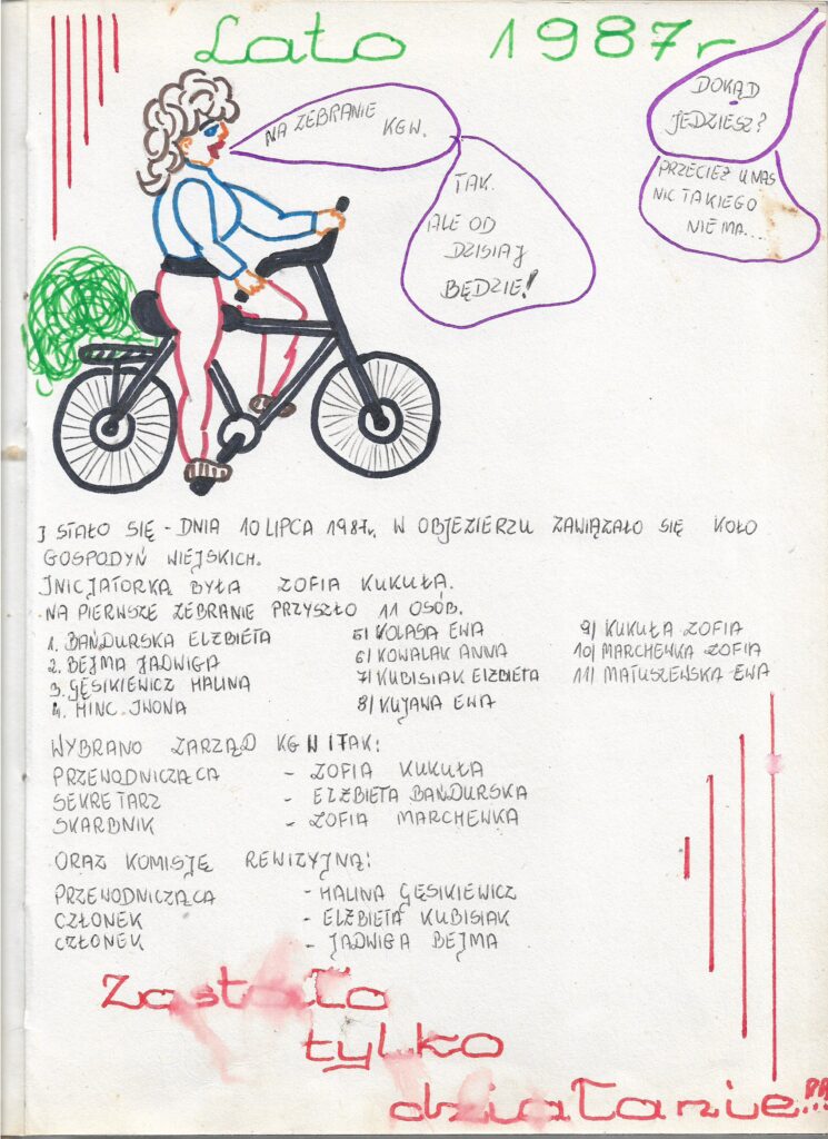 Kronika Koła Gospodyń Wiejskich w Objezierzu z lat 1987-1989. Prowadzona przez moją mamę, pisana odręcznie i opatrzona kilkoma zdjęciami z imprez KGW. W załączeniu rownież dokumenty: prośba o zezwolenie na zorganizowanie „Wieczoru Tanecznego” do komendanta MO w Obornikach, umowa z zespołem EFEKT oraz protokoły z zabrań KGW.