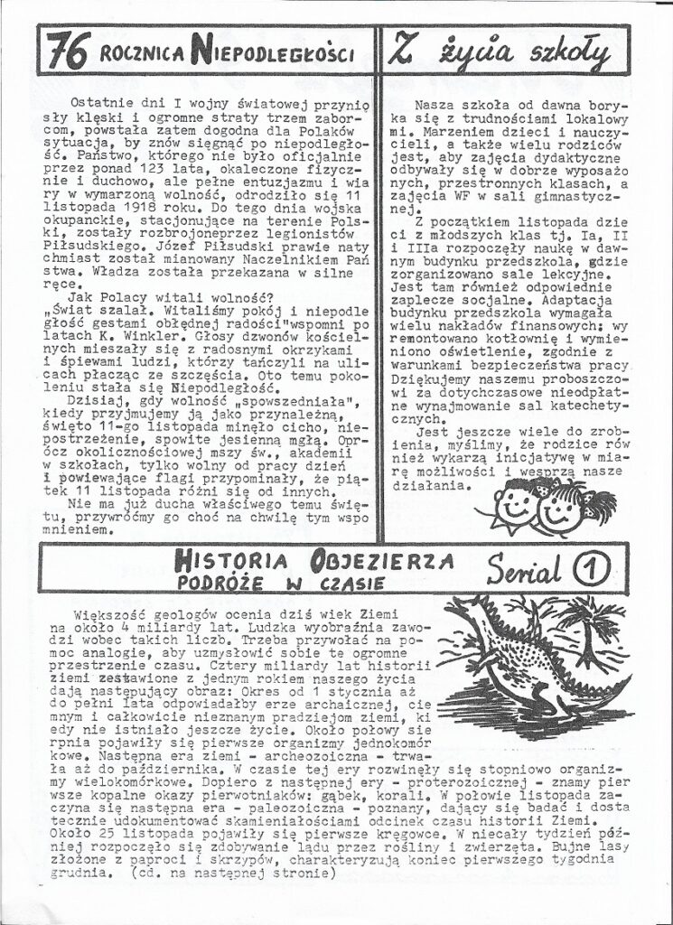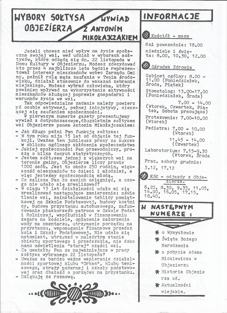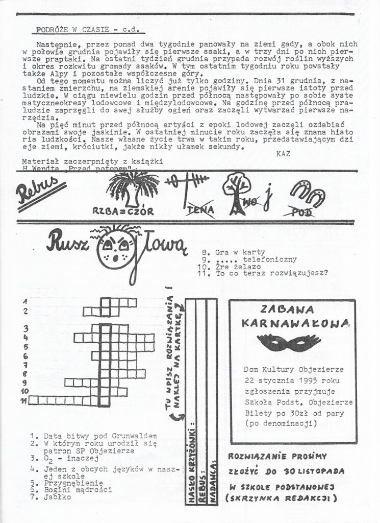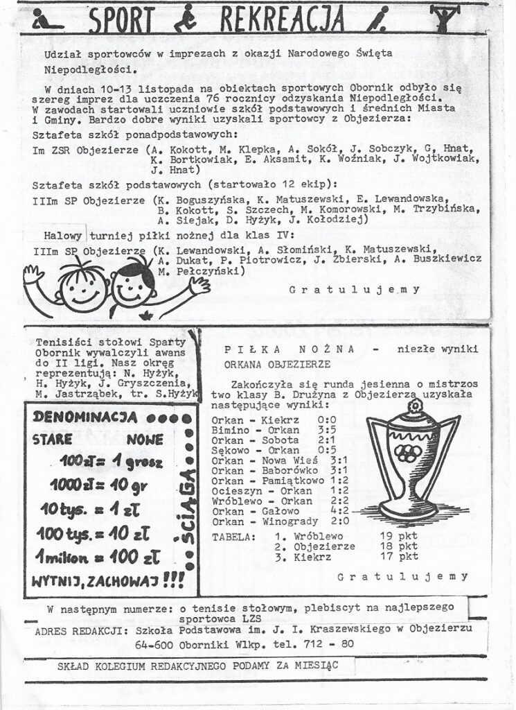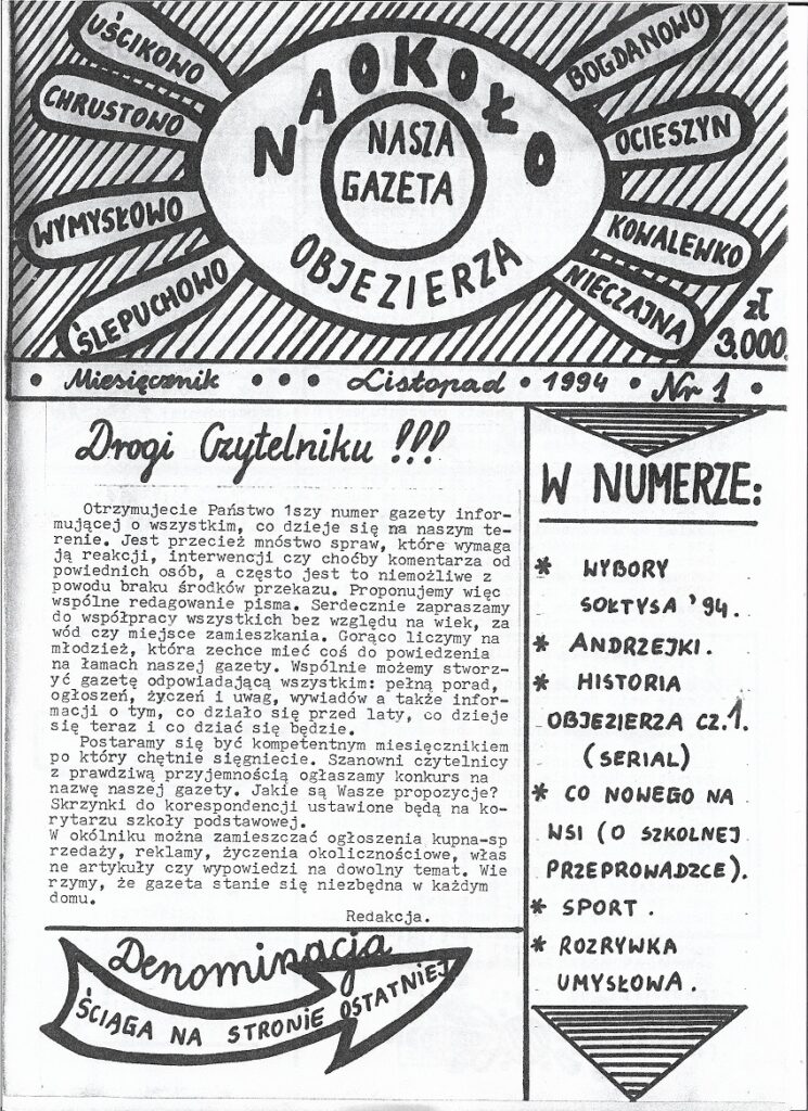 Tak oto zaczyna się pierwszy numer gazetki objezierskiej wydany w listopadzie 1994 roku redagowanej i wydawanej przez kolegium redakcyjne w Szkole Podstawowej im. J. I. Kraszewskiego w Objezierzu. Dzięki uprzejmości Przemysława Krusickiego, członka ówczesnej redakcji, będziemy mogli cofnąć się do dawnych czasów i powspominać wydarzenia z lat 90′.