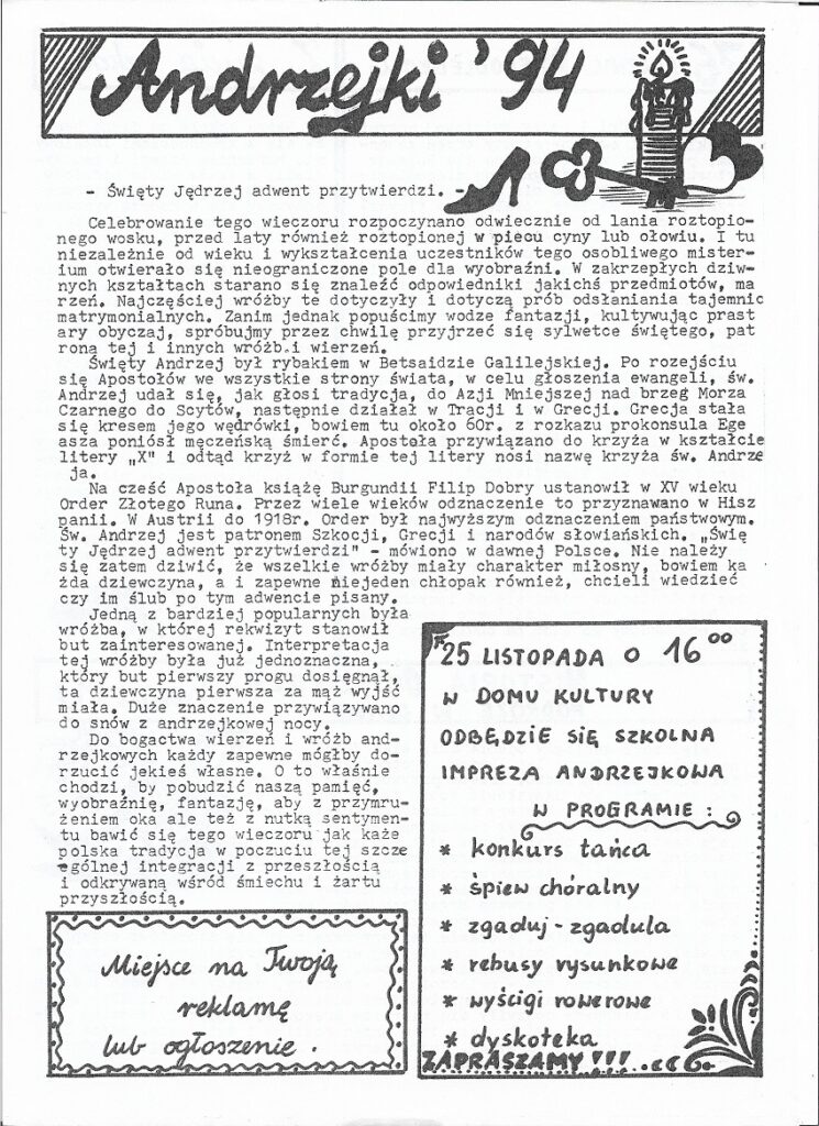 Postaramy się być kompetentnym miesięcznikiem, po który chętniesięgniecie. Szanowni czytelnicy z prawdziwą przyjemnością ogłaszamy konkurs no nazwę naszej gazety. Jakie są Wasze propozycje? Skrzynki do korespondencji ustawione będą no korytarzu szkoły podstawowej. W okólniku można zamieszczać ogloszenia kupna-sprzedaży, reklamy, życzenia okolicznościowe, własne artykuly czy wypowiedzi na dowolny temat. Wierzymy, że gazeta stanie się niezbędna w każdym domu.